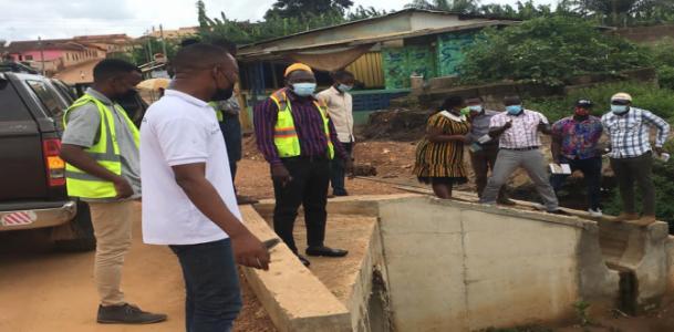 The Municipal Chief Executive for the Agona West Municipal Assembly inspects the contsruction of a new culvert