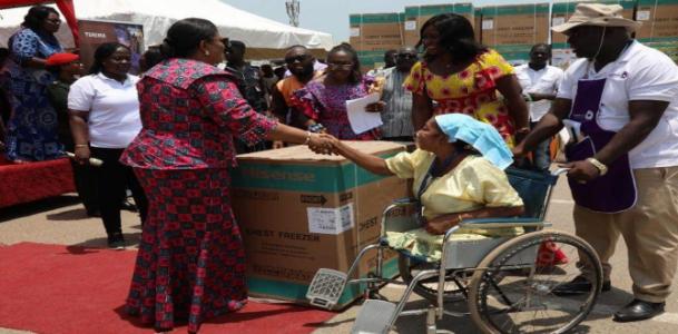 The First Lady of the Republic of Ghana, H.E. Mrs Rebecca Naa Okaikor Akufo-Addo through the Rebecca Foundation once again in her benevolent works distributed assorted items and cash prizes to improve upon the livelihood of some needy and physically challenged women in the Central Region.